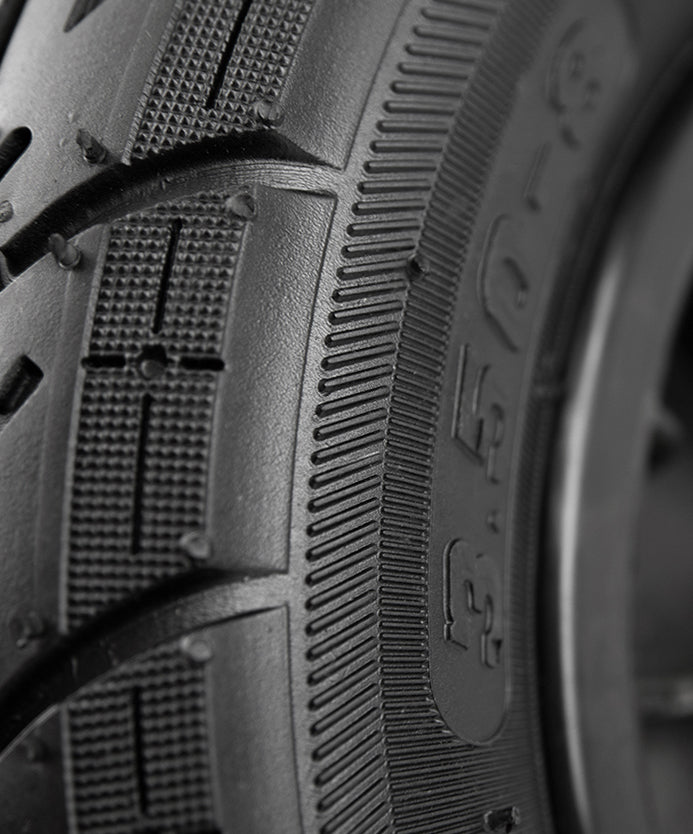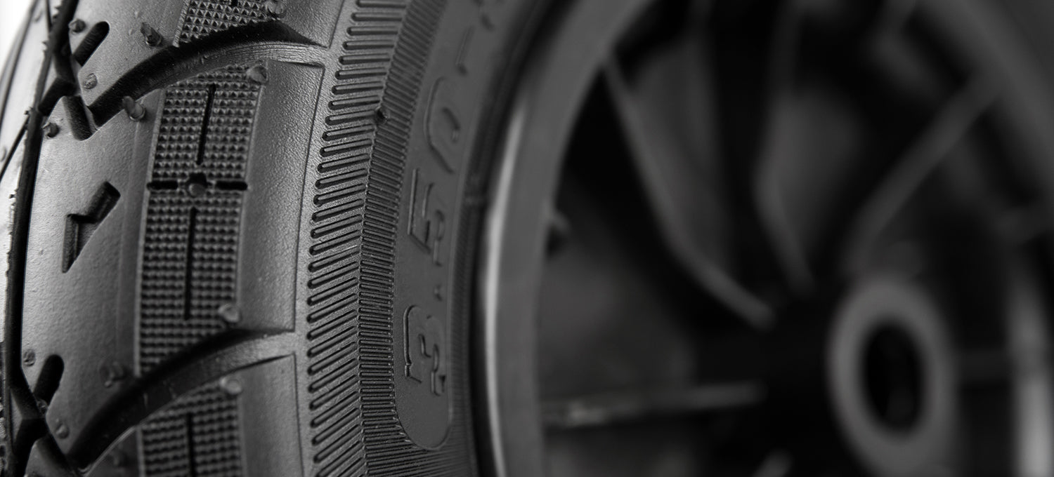 Our new tires are now 14” in diameter and about 4” wide. They are made of 4 ply reinforced vehicle grade natural rubber which holds up well against UV rays, heat and salt water for up to ten years. To prevent air loss, we use an advanced butyl inner tube for our wheels with an “L” style cooper air valve. The rim is made of reinforced nylon with a 1” diameter hole for the axle with NO bearing as this product is made for marine use. These high quality marine grade tires and rims will last you for many years of trouble free use.