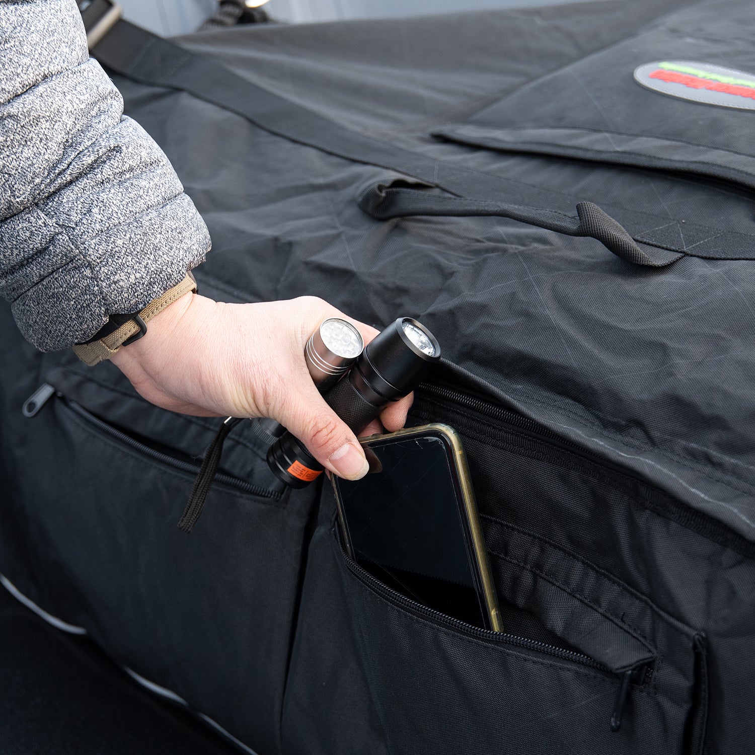 Multiple storage pockets with water-resistant marine zipper, one large pocket at the top to keep your map or your foot pump, 2 pockets on the front to keep your food and drinks and one pocket inside the bag to keep your boating documents, phone or wallet.